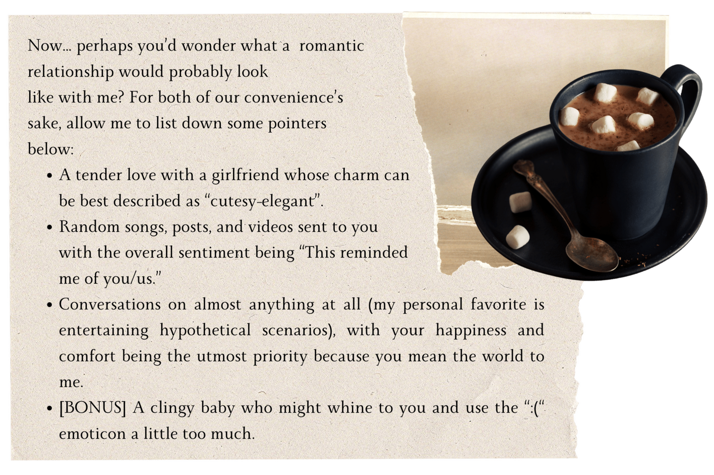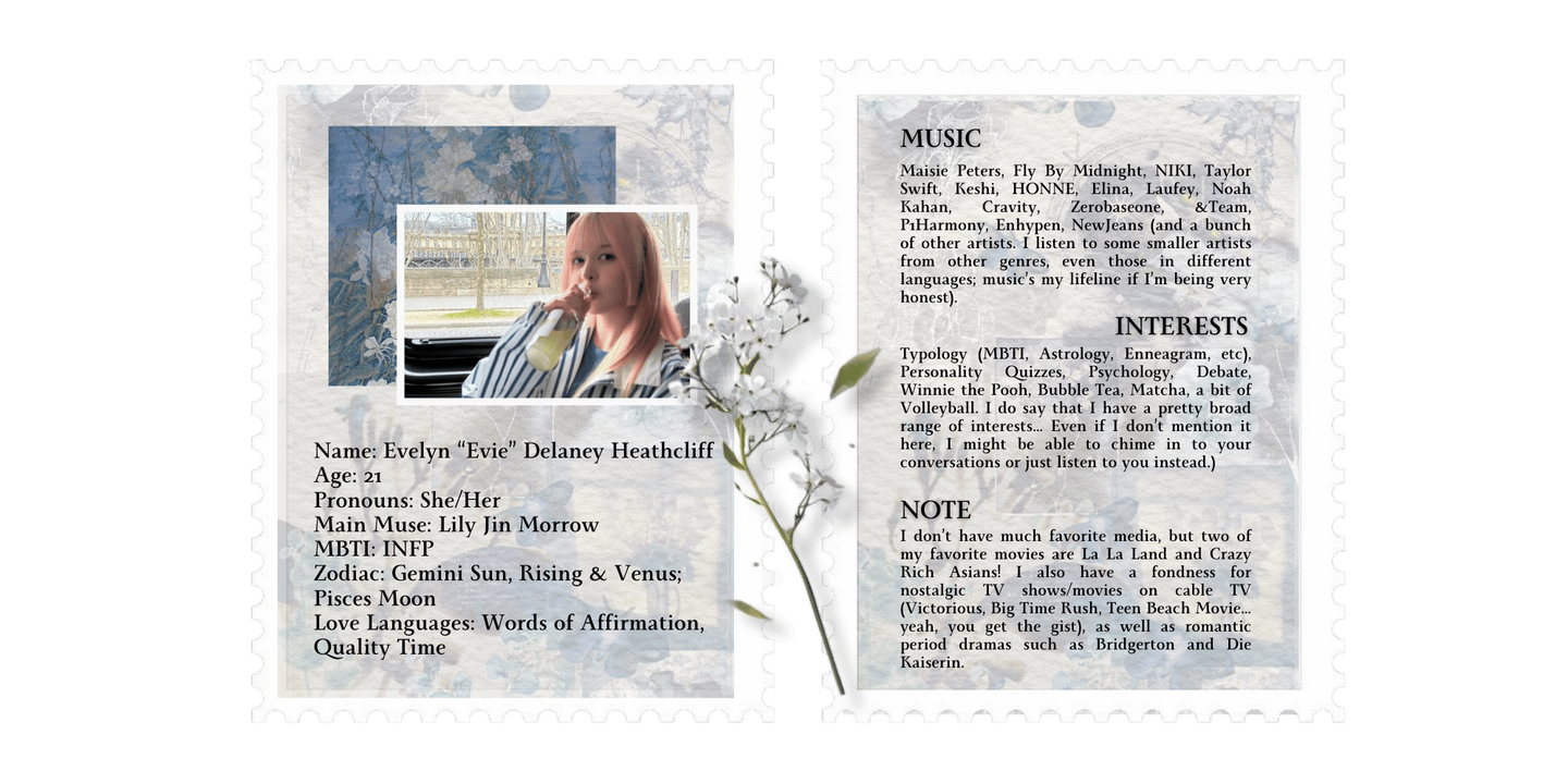 For starters, perhaps I’ll allow for the people around me to describe how I am instead? Hi, I’m Evie, and I’m more than happy that you’ve chosen to stop by.How would I describe myself? I’d suppose my friends would say that at the start… I can seem kinda aloof. All prim and proper, slightly reserved, it’s a given since I would keep to myself when I first come across someone new. However, I truly believe that my first impression isn’t all there is to me. I’d like to describe my love as… cozy. Like a warm beverage on a chilly day, or a blanket to shield you from the cold. I’m all-encompassing when I love… There's so much devotion that flows through my veins when I give my heart out to someone; I’m someone who wears her heart (very conspicuously) on her sleeve.At a glance, there may be an archetype that I play into: the calming, sweet, reliable lover. I’ve come to realize that it’s commonplace for me to be the shoulder to lean on, somebody who’ll wholeheartedly listen to your woes and give you advice with the best intentions. However, a more hidden side of me is the way I can get excitable, scatter-brained, almost similar to that of a kitten. (Strong, independent girlies would need a shoulder to cry on every now and then too, right?) I lean more into the lovey-dovey dynamic, but I’m always more than happy to banter with you lightheartedly since teasing (and flirting with) you would probably be something I excel in best. I’m also incredibly fond of thoughtful conversations; whether this be in the form of an exchange on our deepest vulnerabilities to discussions on definitions of pop culture terminology, I’m always more than happy to lend you an ear.
